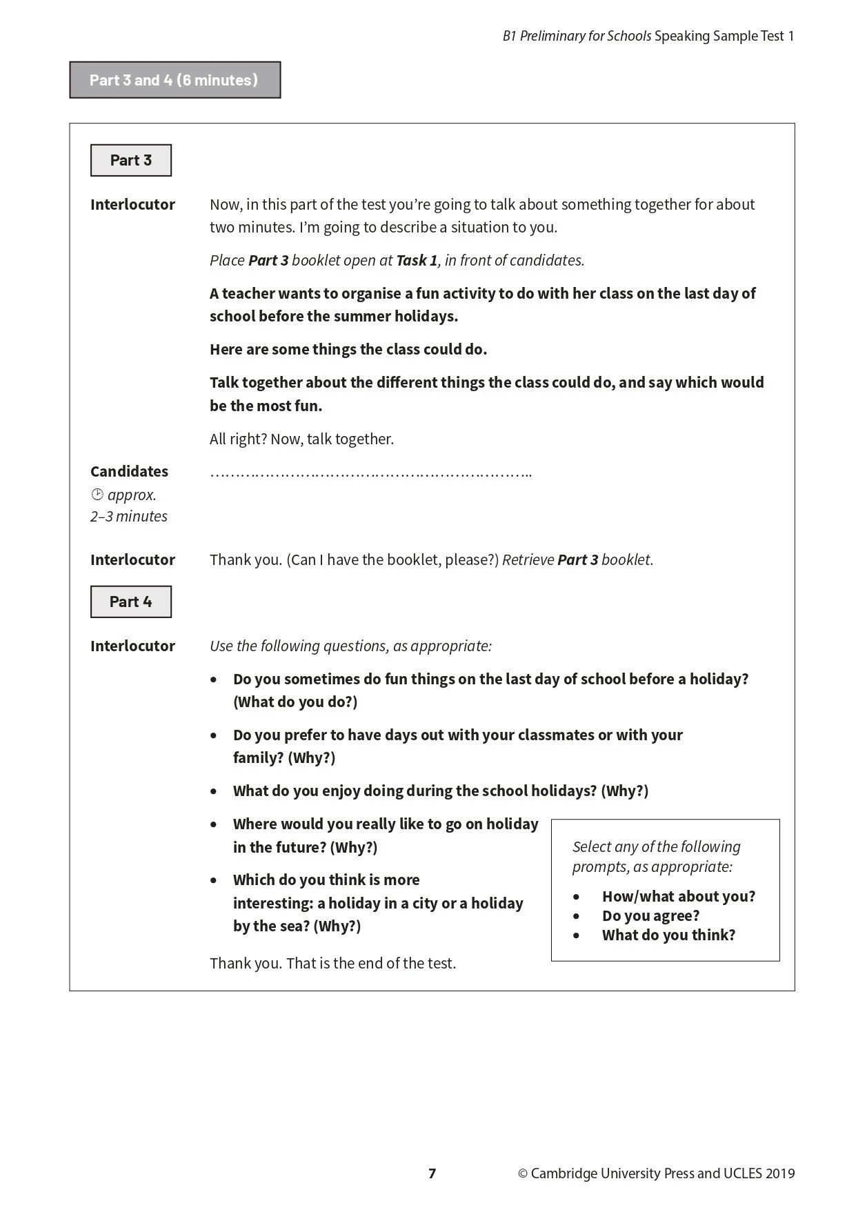 Página de un material de prueba de inglés para escolares, que incluye instrucciones para una actividad de conversación sobre las vacaciones escolares, con preguntas para practicar.