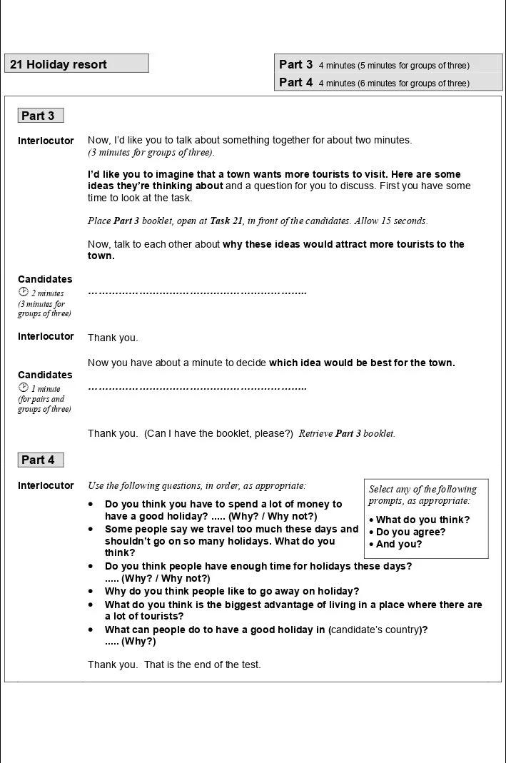 Página de una guía de actividades para practicar conversación en inglés, con instrucciones para hablar sobre vacaciones y turismo, incluyendo preguntas para discutir ideas y puntos de vista.